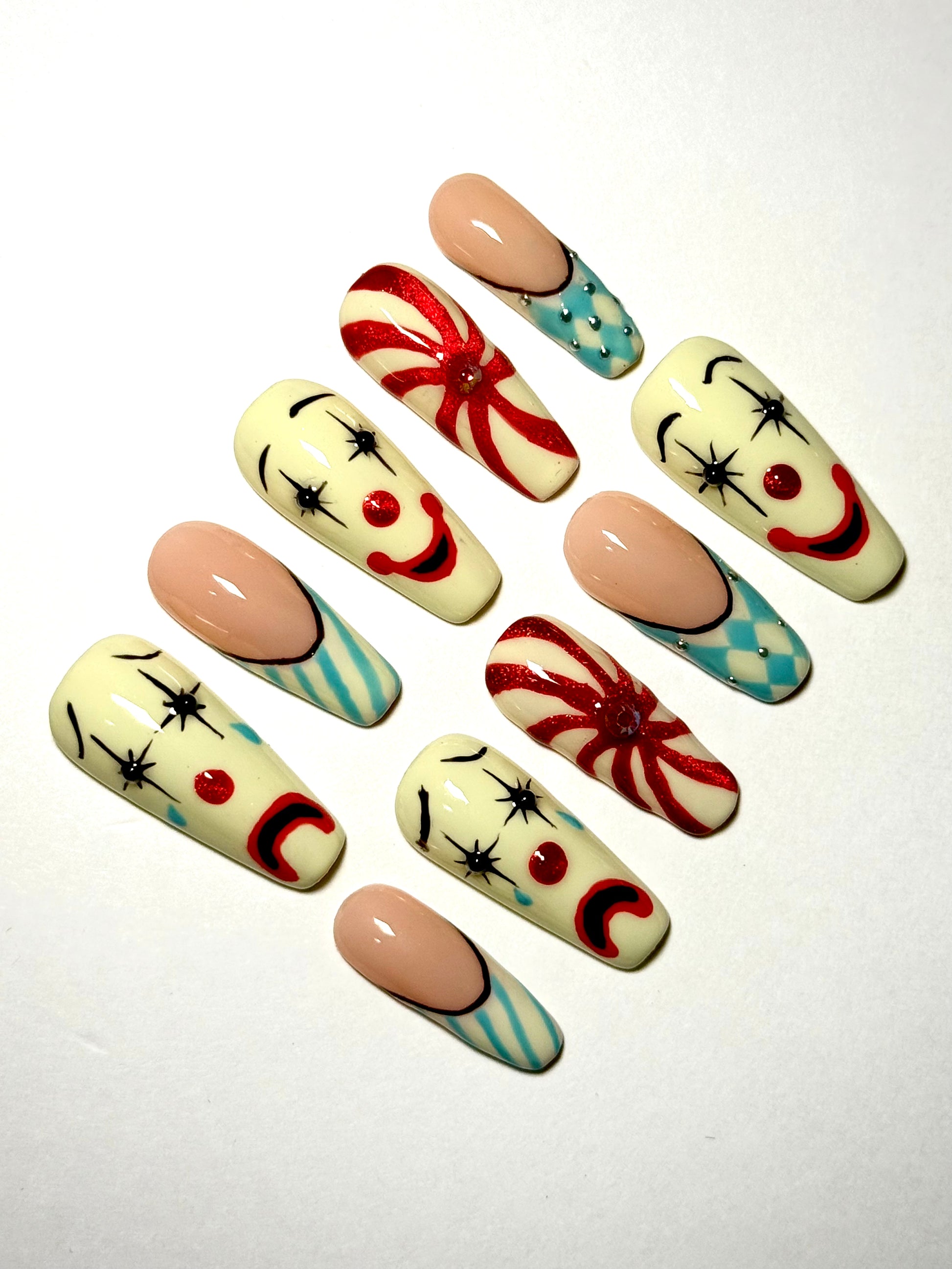 Step right into the spotlight with Freakshow, a daring clown-themed nail set designed for those who love to stand out. Bursting with vivid colors, playful patterns, and a touch of eerie circus charm, this set brings together bold stripes, funhouse details, and whimsical clown accents that turn your nails into a true spectacle. Whether you want a playful clown vibe or something a little more sinister, Freakshow is all about fearless self-expression.