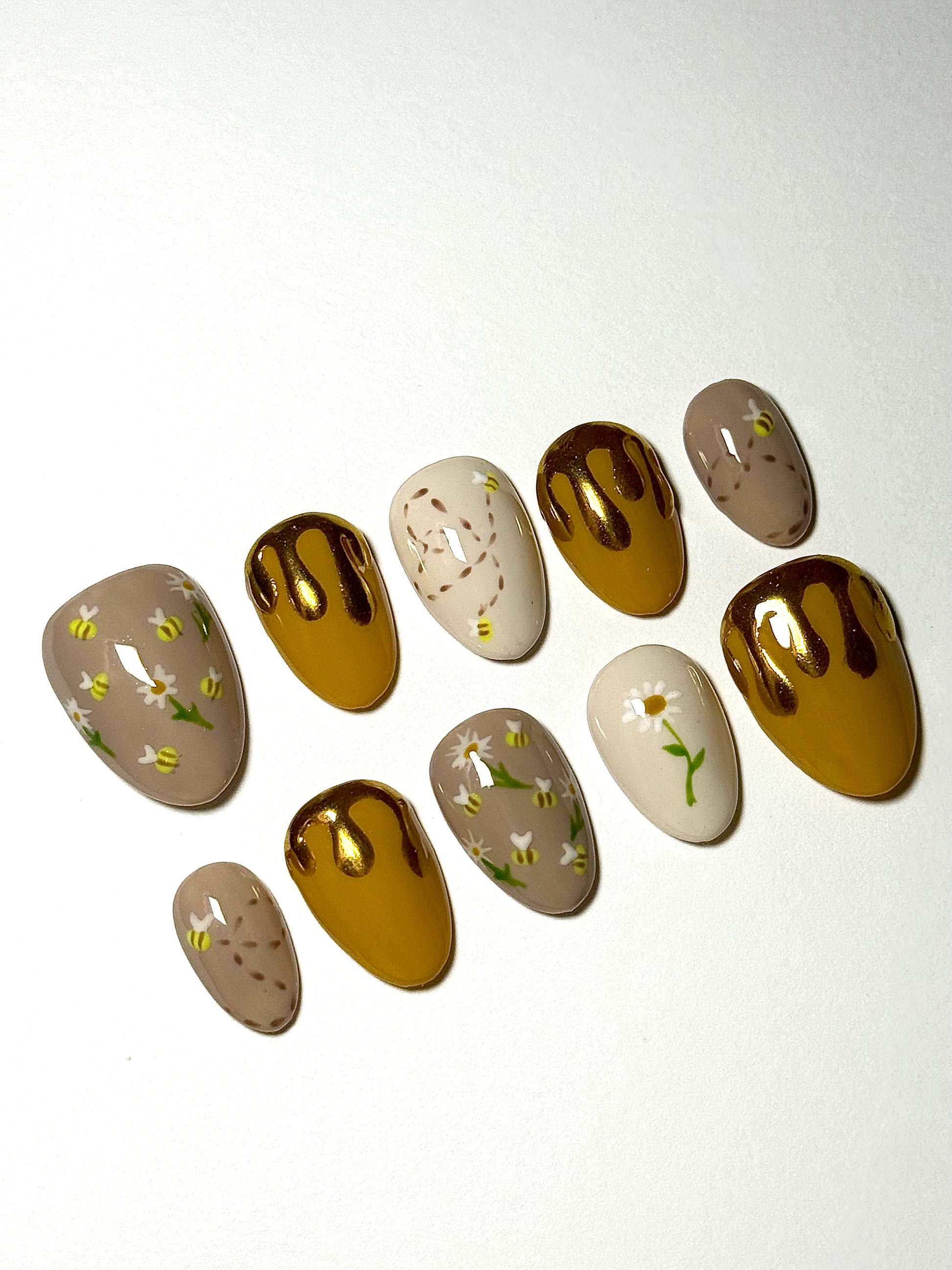 Dripping in gold and buzzing with detail, these Honey Bee Nails transform your hands into a piece of wearable art — made just for you.